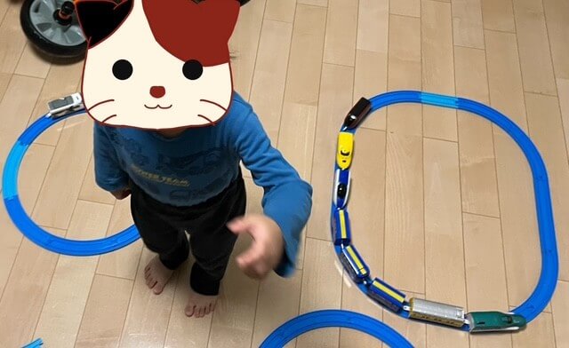 購入してしばらくは、私とパパがレイアウトガイドを参考にコースをつくってあげていたのですが、購入して3か月くらい経った今では、自分でつくったコースで車両を走らせることを楽しんでいます。