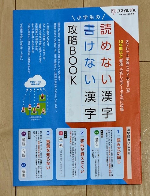 資料請求のおまけと思いきや、スマイルゼミが10年間以上蓄積・分析したデータを学年別に収録したワークになっていて、漢字間違いの傾向を確認できる実用的なワークでした。