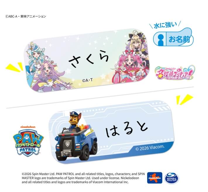キャラクターお名前シールは、パウパトロールと名探偵プリキュアのデザインでした。